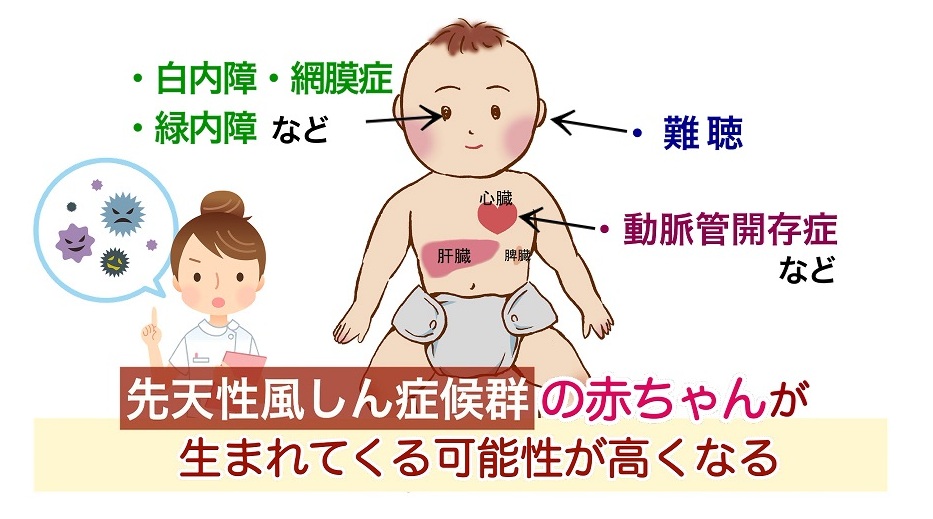 風疹ウィルスは飛沫感染ですが、子どもの30~50%、大人の15%程度は感染しても症状が現れない不顕性感染と言われています。妊婦さんが風疹に罹ったら、生まれてくる赤ちゃんが心臓の奇形が生じたり難聴や白内障・緑内障などの眼科疾患にかかるリスクがあるとして、家族も含めた風疹の「思いやりワクチン」の接種を進めています。